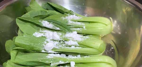 1、上海青放入盆中,加入小苏打,倒入清水浸泡10分钟,再清洗干净。