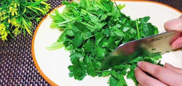 2、再用菜刀把香菜切成小段,或者把它给切碎,怎么切都是可以的。