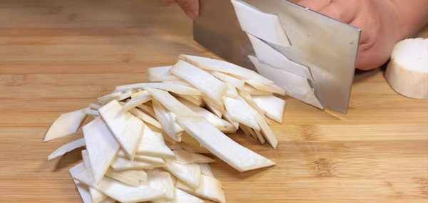 2、洗好之后,放在案板上,用刀切掉根部,再对半分开,切成这个样子。