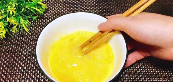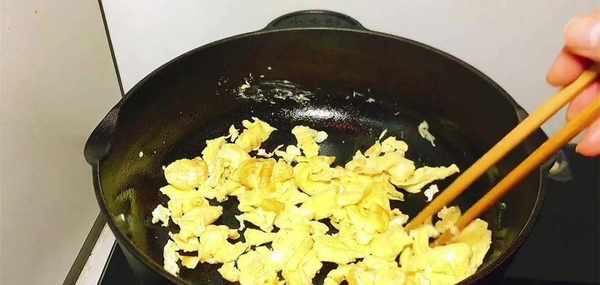 4、起锅烧油,倒入鸡蛋液,小火慢煎,煎至定型后,再快速翻炒熟。