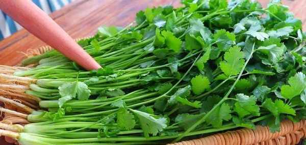 1、准备1把香菜,摘去根部,用自然水清洗干净,再沥干水分备用。