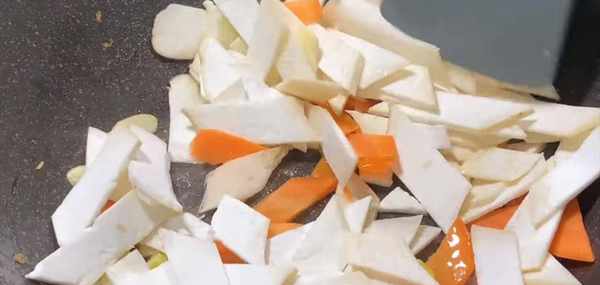 6、锅中加油,放入蒜姜炒出香味,再把切好的胡萝卜和杏鲍菇也加进来。