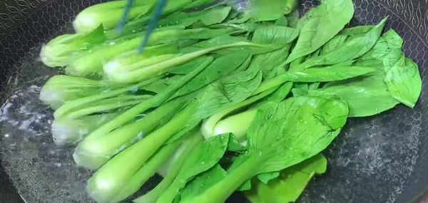6、锅中水烧开,加入食用油,放入上海青,焯水20秒,立即捞出控水。