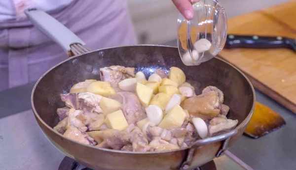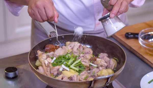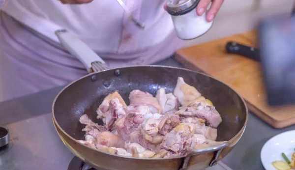 将鸡肉放入热油锅中,直至炒出鸡油没有水分为止,然后撒上适量盐。