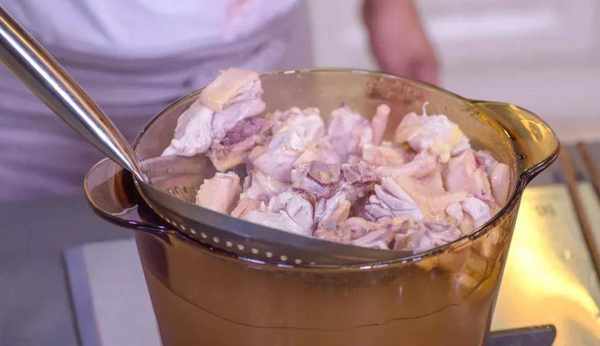 把鸡肉切成块状,放进开水中氽烫后捞出备用。