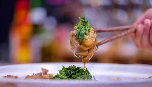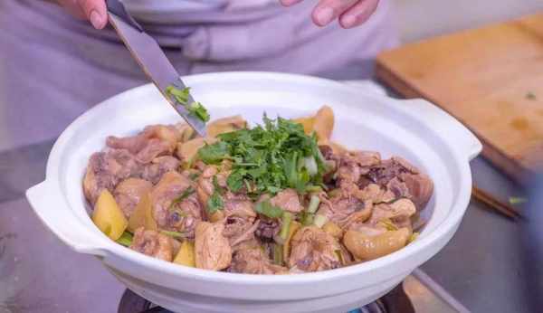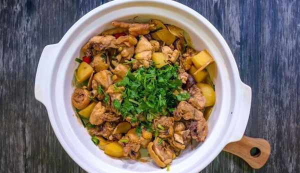 炒好的鸡肉倒入砂锅中,香菜放在鸡肉上。