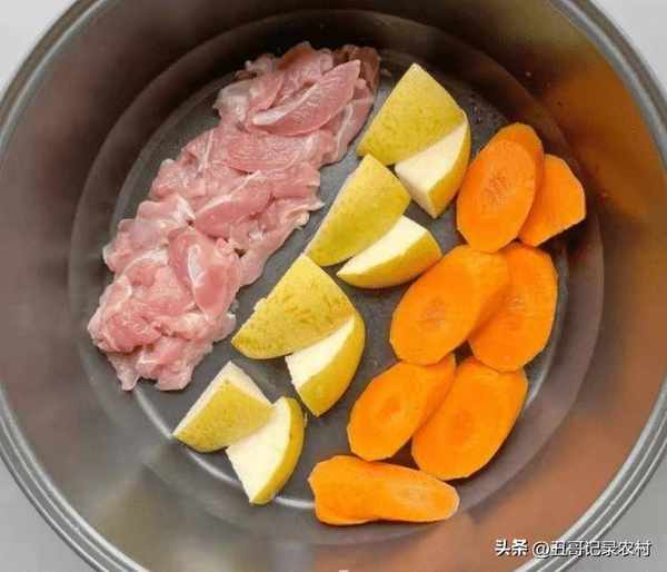 选料:买雪梨一个加足水,选新鲜胡萝卜一根(萝卜中胡萝卜最受欢迎,适合炖汤),买几颗无花果干,准备260克左右的新鲜瘦肉(如果有的话)家里有条件的,可以选择排骨),盐少许,胡椒粉少许,水1500毫升,盐少许,胡椒粉少许等。