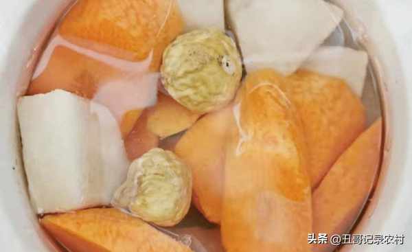 第四步:准备一个炖锅,放入胡萝卜和梨,放入几颗无花果,放入适量的水,大火炖30分钟。