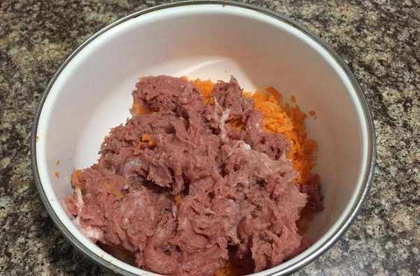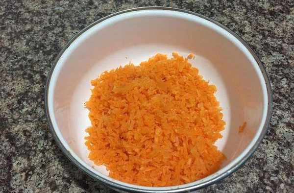1、胡萝卜去皮洗净,先用擦丝器擦成丝,再用刀切碎,装入碗中备用。刀功好的也可以直接切丝再碎。