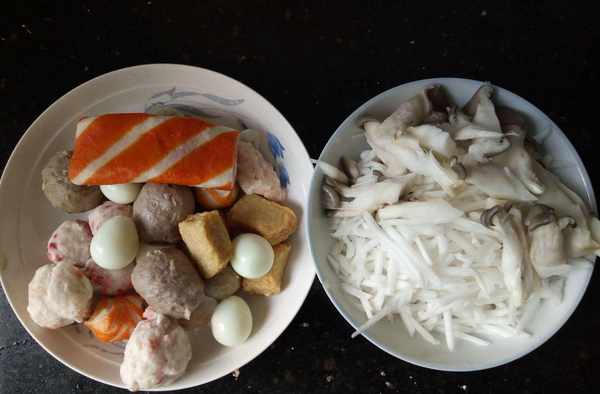 2.准备各式火锅丸子,平菇切小块。