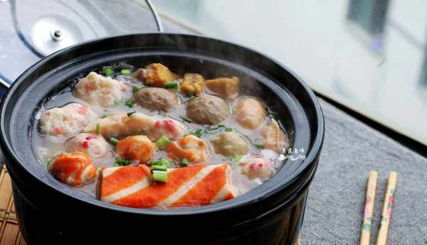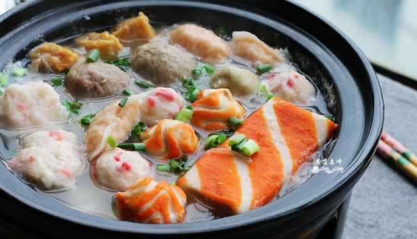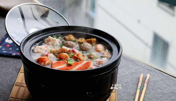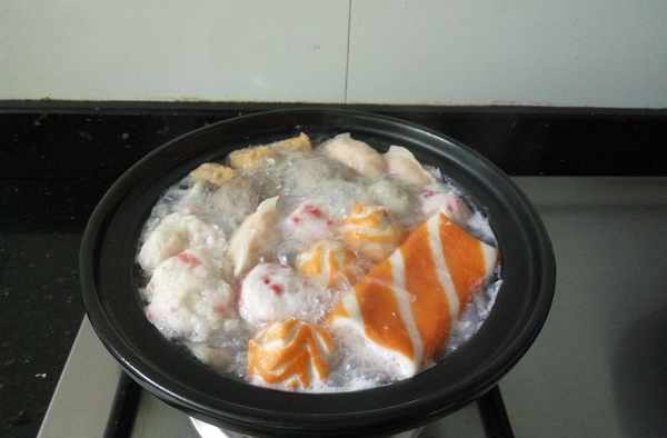 4.再次煮开后,放入各种丸子,加入盐,煮熟。