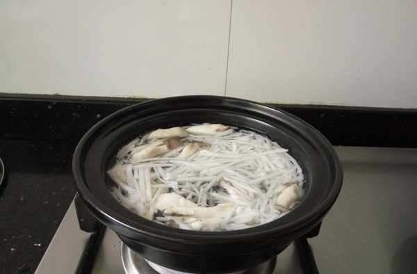 3.酒精炉砂锅内胆放水烧开,加入萝卜丝和平菇。