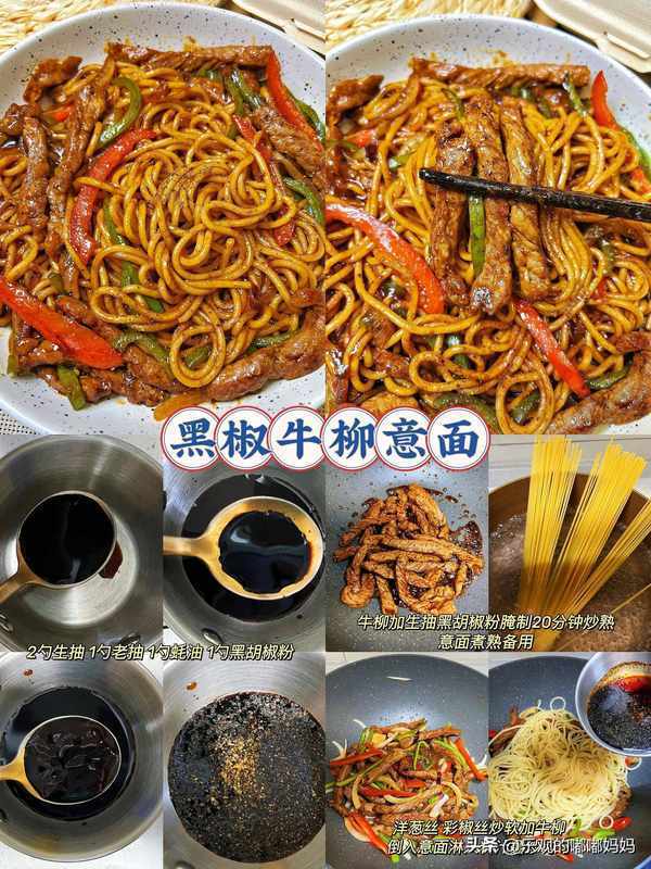 炒熟备用,意面煮熟备用3锅里热油炒软洋葱丝 青红辣椒丝再加入牛柳和意面淋入料汁翻炒均匀就好啦