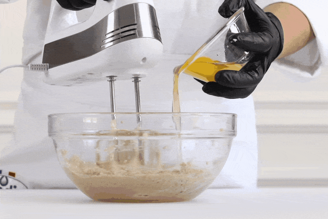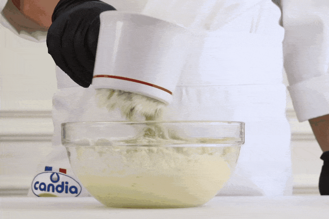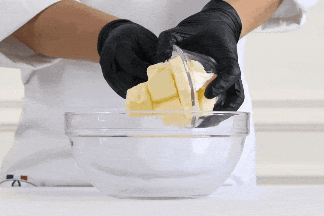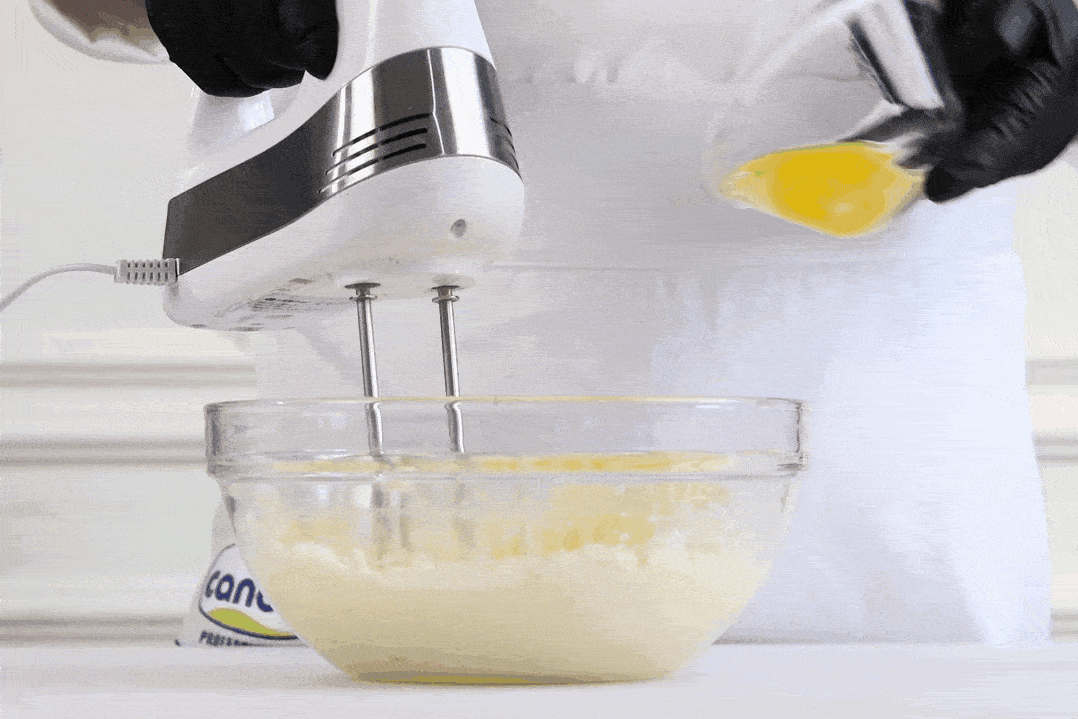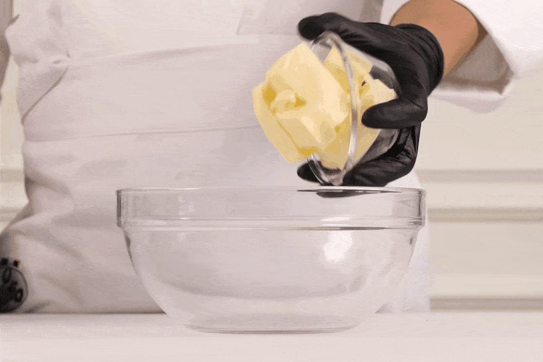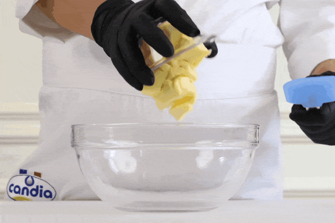 室温软化的肯迪雅发酵黄油、砂糖、盐一起倒入碗中,打至略微发白。