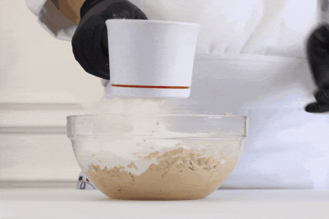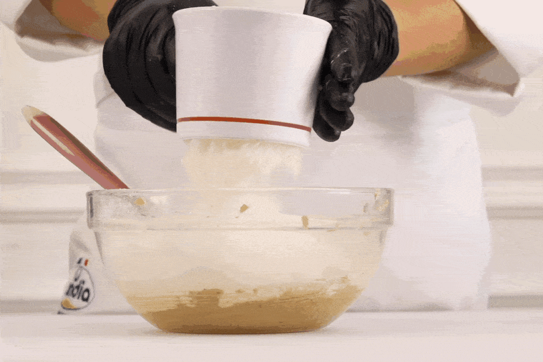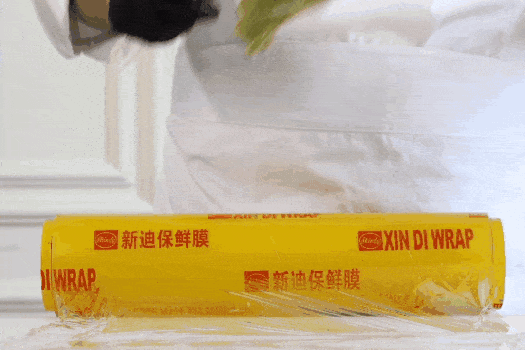 将过筛的蛋糕粉、泡打粉用刮刀翻拌均匀,封上保鲜膜冷藏半小时。