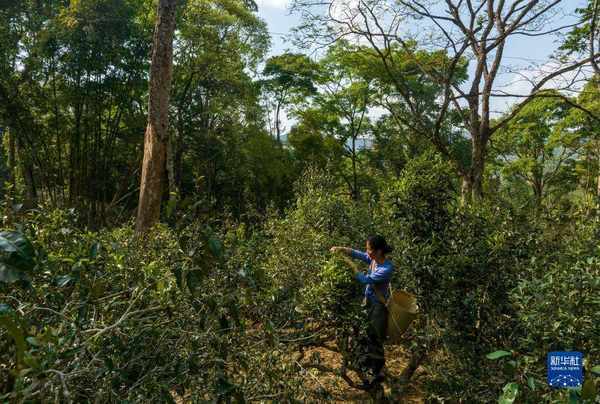 3月25日,景迈山茶农张小莉在古茶林里采茶。