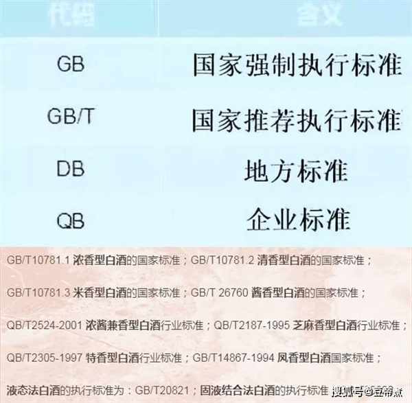 白酒的执行标准有很多种,最常见的是国家强制执行标准(GB)和国家推荐执行标准(GB/T),除此之外还有地方标准(DB)和企业标准(QB)。