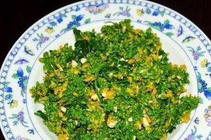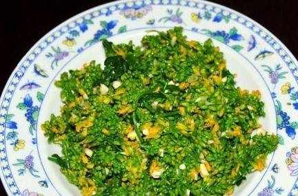 4、将用开水汆好的油菜花用凉开水冲一下,挤干水分,放入蒜沫,盐,味精,醋和麻油搅拌即可;