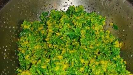 3、将盐水泡好的油菜花用清水洗一下,放入开水中汆一下,速度要快,放入开水中就捞出来,时间长了,油菜花的香味就没了;