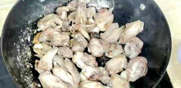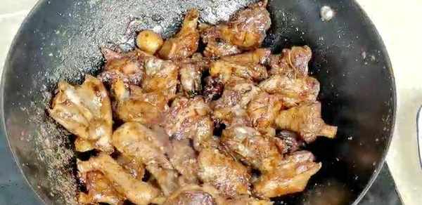 一直炒到鸭肉紧缩表皮有点焦黄。