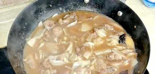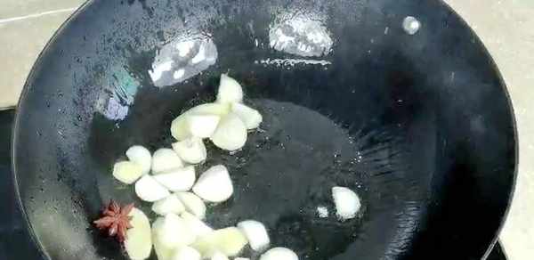 把锅洗干净,下油,油温6成热下姜片、八角、草果、蒜爆出香味。