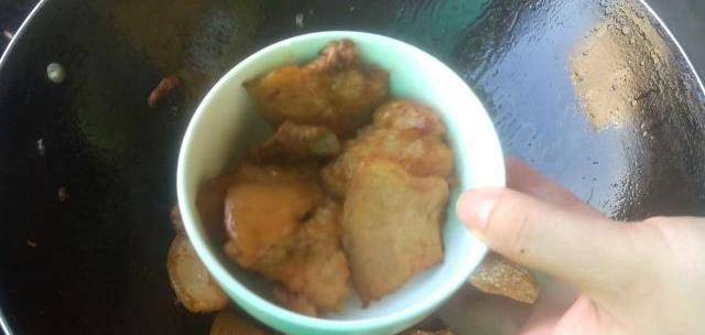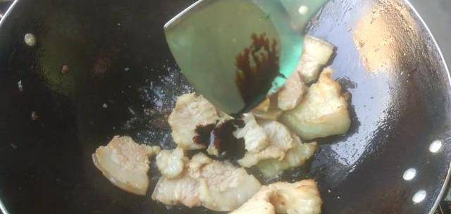 6锅烧热,倒入五花肉煸炒,中火把它炒至出油,把五花肉尽量炒干一点,这样吃起来才更香;然后倒入老抽调色,再翻炒均匀铲出放碗里备用。