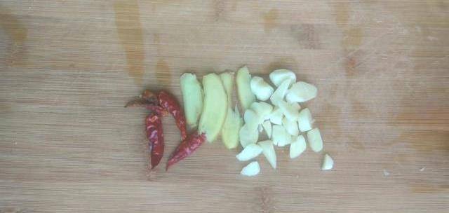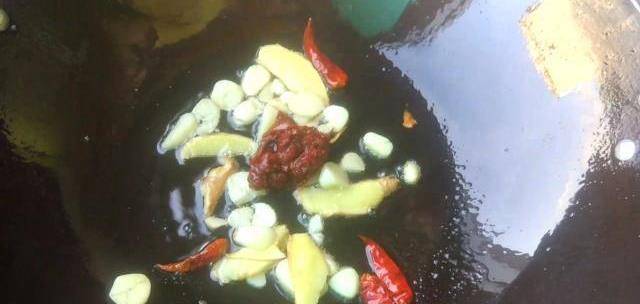 7再起锅烧油,放姜片、干辣椒、蒜头、豆瓣酱炒香,然后倒入花菜翻炒均匀。