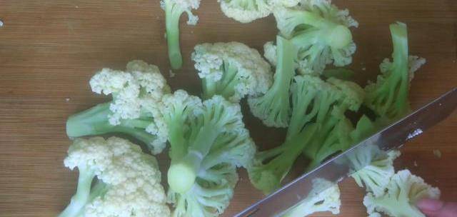 1把整棵的花菜切一半下来,再用刀把它切小朵,用手撕也可以,全部切好再清洗干净。