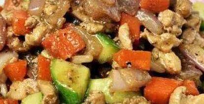 第四道菜是黑椒五彩鸡丁,首先我们需要准备:鸡脯肉、洋葱、胡萝卜、黄瓜、黑椒酱、料酒、干淀粉、生抽、黑胡椒。我们先把胡萝卜洗好切成胡萝卜丁,把洋葱和黄瓜洗干净也切成丁。把鸡脯肉洗干净切成肉丁,准备一个碗放入料酒、黑椒酱、干淀粉搅拌均匀,把肉丁放进去开始腌制。起锅烧油,把洋葱、花萝卜丁放进去开始翻炒,加入黑胡椒翻炒几下,最好放入肉丁和生抽,不停的翻炒,这样味道才能更好的融入到肉里边,等到肉变为黄色的时候就可以出锅了。