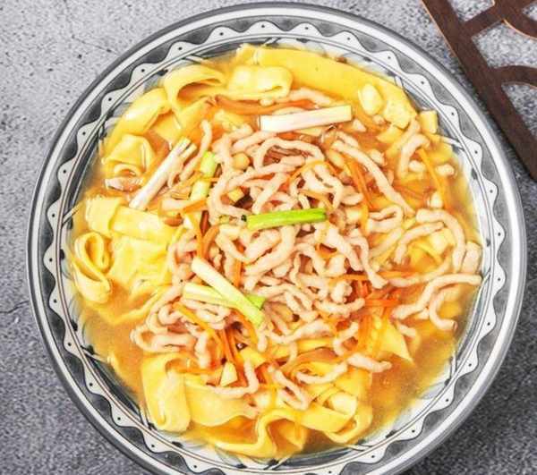 锅烧热,放入花生油炒香蒜末,加入胡萝卜丝、高汤、葱姜汁料酒、蚝油、鸡粉、盐、胡椒粉烧开,放入肉丝、蛋皮煮一分钟左右,放入葱段,淋上麻油,捞出装入碗中即可