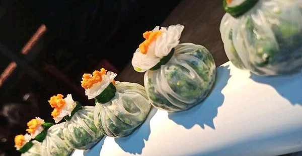春卷皮用温水泡软后把香干马兰头包成石榴包状,用小葱叶扎紧,加海胆酱点缀即可