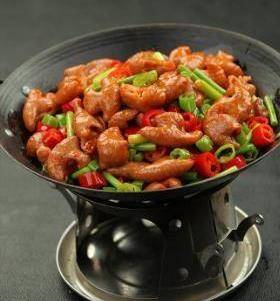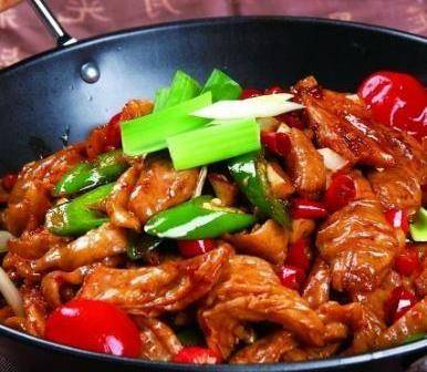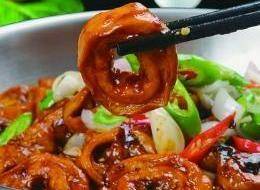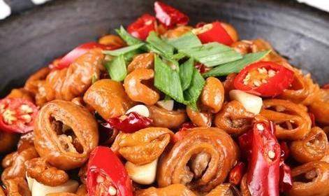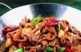 盖好锅,炖肥肠直到慢炖,直到汤变干为止。加入胡萝卜和芹菜3分钟,然后加入洋葱,青椒和红辣椒片,炸1分钟,撒上鸡精,葱花,从锅中倒出。