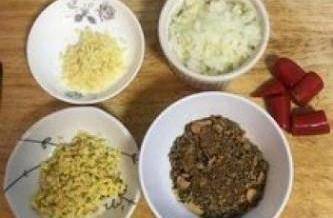 8洋葱切小丁、蒜头和姜都切末;辣椒略切;五香卤包拆开倒出。