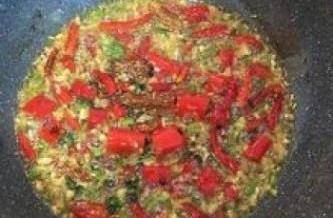 12接着放入干辣椒、新鲜辣椒和葱花(如有放香菜亦可于此时下锅)ㄧ起炒香,炒香后关火;