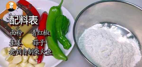 面粉、青红椒、生姜、蒜子、老刘自制柴火鱼。