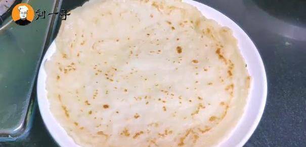 7,、拿出一个不粘锅,烧热后倒入少许色拉油,然后把调好的面糊,倒入一部分到锅中,这时轻轻晃动锅子,把整个面糊均匀的铺入锅底,全程要用小火,等饼子定型即可翻面,等另一面定型成微黄,即可装盘。