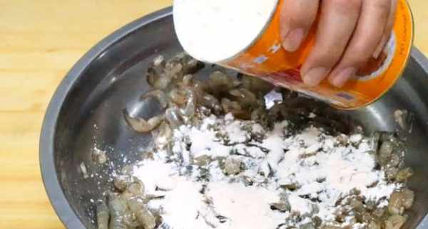 【步骤三】现在往腌制的虾盆里面,加入少量的吉士粉。吉士粉起到的是增香增色的作用,也可以用面粉来代替。然后再加入少许的玉米淀粉,用手将小河虾拌拌均匀。把每个小河虾都裹上了玉米淀粉,就可以开始烹饪了。