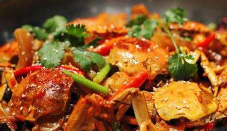然后这个时候我们就可以把锅里的底油留下,然后再把所有的调料都放到锅里面,翻炒出香味的时候,就可以把螃蟹倒到锅里面炒,再到螃蟹的同时,就可以放入我们刚才准备好了的料酒,也一起倒到锅里面,炒个5分钟左右即可出锅装盘使用了。
