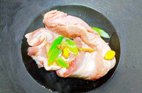 ①我们把五花肉的皮贴着锅烫一烫,再刮一刮,搓洗干净,放入锅中。加水没过五花肉,放入葱、姜、料酒去腥。开大火煮,水开后捞出表面浮沫。等五花肉表面变色后捞出来,用温水冲洗一下,切成小块。