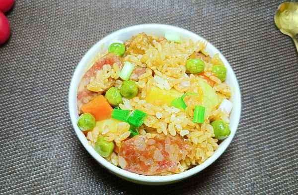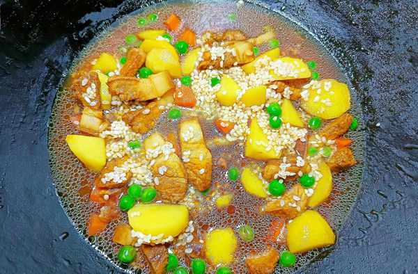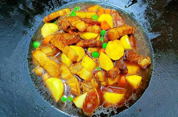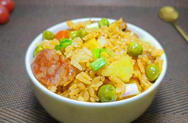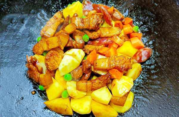 ④把土豆、胡萝卜、豌豆米、腊肠全部倒入锅中,再次翻炒几下,让食材充分混合在一起。