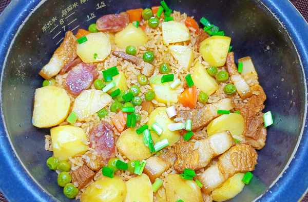 食材准备:土豆200克、豌豆米80克、腊肠少许、五花肉150克、葱、姜、料酒、胡萝卜少许、盐、食用油、生抽、老抽、大米400克