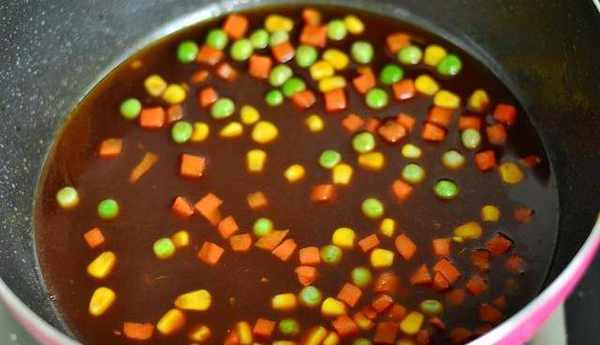 5:另起锅倒入水80g、陈醋50g、细砂糖40g、生抽30g、料酒20g煮开。倒入葱姜蒜。煮下。煮好后。过筛掉葱姜蒜。倒入番茄酱。倒入蔬菜丁。混合均匀。稍煮下,加些盐,出锅。