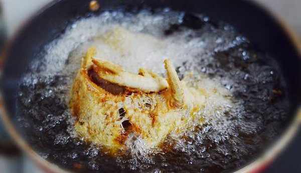 4:锅中倒入大量的油,烧热,放入鱼,并用铲子把鱼头立起来定型几分钟。然后侧着放在锅中炸制金黄色。