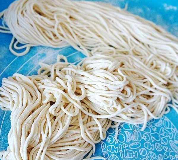 第4步、再用压面条机把面片压成面条,这就是细面条,比起龙须面还是要粗很多,所以特别适合吃炸酱面。