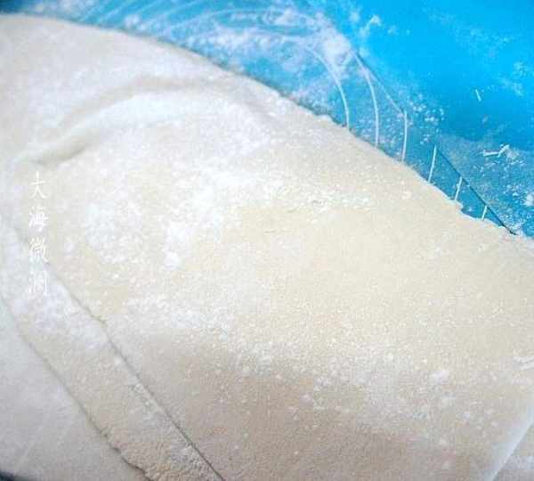 第3步、在面饼上多撒一些面粉,用手动面条机压成面片,这个面片就很长,压好的面片注意撒些面粉,避免粘连。