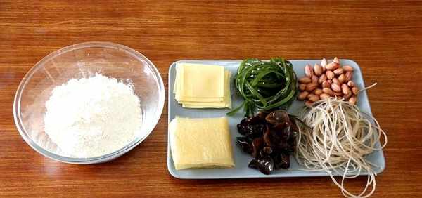 海带,木耳,花生仁,红薯粉丝,千张,豆腐皮,面粉,盐,生抽,醋,胡椒粉。