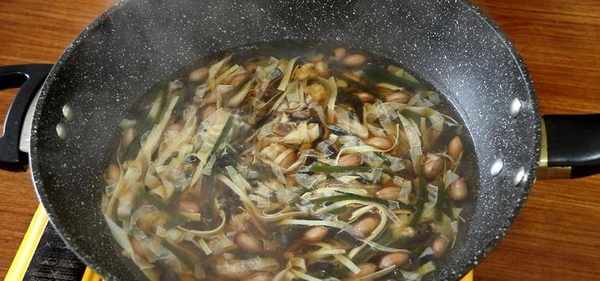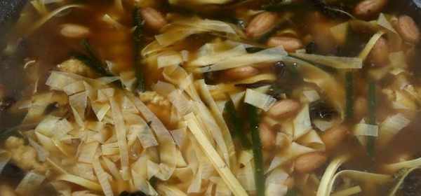 花生米煮熟后放入海带丝、木耳丝和粉丝一起煮。