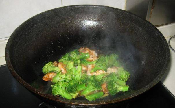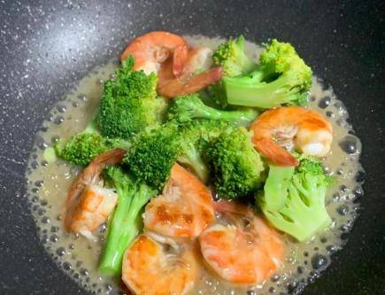所需要的食材:西兰花一颗,鲜虾8个,花生油适量,盐适量,生抽适量,蚝油一勺,胡椒粉10克,淀粉10克。