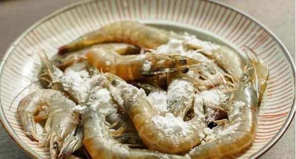 第二步:鲜虾用清水冲洗干净后,用剪刀剪掉虾头和虾脚,再去掉虾线后,用简单从虾背剪开翻进盘中,再加入10克淀粉,搅拌均匀备用。