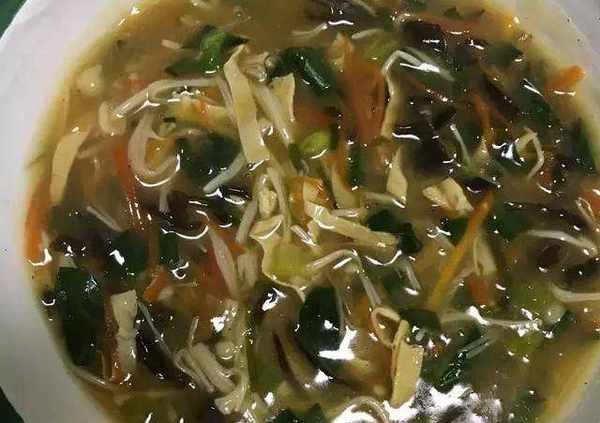 准备好食材干黄花菜和干木耳分别用温水浸泡1个小时,红薯粉条清水泡软,食材捞出洗净。再将黄花菜切小段,木耳切宽细丝,熟牛肉切成小肉丁,菠菜洗净切成小段,海带和豆腐皮叶分别切丝。面粉装入大盆,面粉用少许水,用筷子搅成面絮和成面团,饺子面的硬度即可,面团覆盖保鲜膜醒30分钟盆中加入清水,面团浸泡5分钟。然后反复抓洗泡好的面团,直到面团变深时面筋就洗好了洗面筋的水千万别倒了,留下备用,洗好的面筋准备调味品,添加一锅清水,水煮开后加入黄花菜和海带丝煮开再加入熟牛肉粒,然后加入粉丝等锅里水再煮开洗好的面筋团揪成小面筋片,逐个加入汤中。煮沸搅动后,加入豆腐丝改大火将整锅汤汁煮沸把洗面筋剩的面水先用筷子搅匀,一勺一勺倒入锅里,用筷子顺时针充分搅动均匀,直到添加到汤汁浓稠。再次沸腾时调入生抽,加入适量食盐,加入适量鸡精也可不放,加入适量十三香和黑胡椒粉继续煮3分钟后,加入菠菜段,加入香醋,淋上芝麻香油即可食用。黑胡椒粉和香醋的用量大一些更出味哦!哇哦,好美味的一碗汤!配上一个大面饼,惬意!你也试试吧?